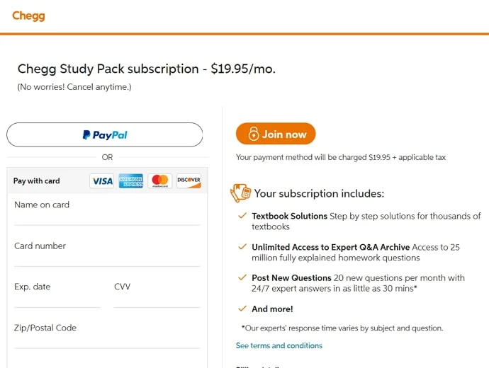 If you want an answer to any question on Chegg, We recommend you to sign up for a Chegg Study subscription, it cost you only $15.95, but you can Cancel Anytime For FREE if you don’t like it. So you don’t need to worry about the money as you can cancel your subscription for free, and you do not need to pay $15.95 – You will get the amount back. Here’s how you can subscribe to Chegg Study – Cancel Anytime for FREE: