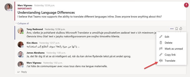 On your desktop PC, select More options > Translate at the top of the message if you receive a message in a different language. It displays a translation of the message into the language you’ve designated for Teams.