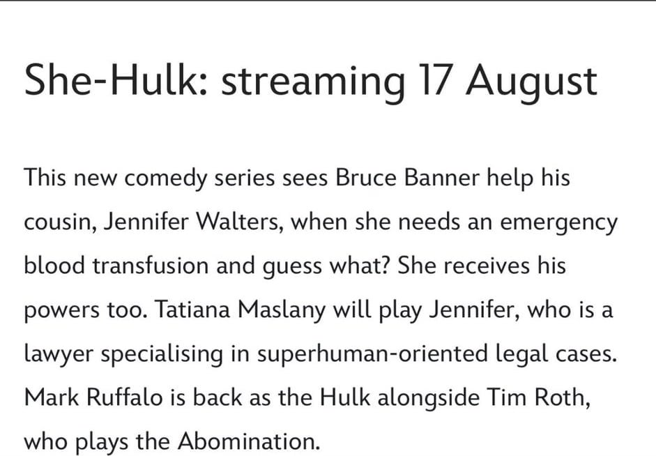 She-Hulk is the upcoming Marvel series that will release on Disney+. This series will make a debut of a new superheroine that is She-Hulk played by Tatiana Maslany. In this series, we are also going to see Mark Ruffalo‘s Hulk and Tim Roth‘s Abomination. This series has some releasing problems as fans speculated it will release after the Moon Knight series. But this series went to reshoots and for that reason, it didn’t come after Moon Knight and Disney+ CEO Bob Chapek confirmed that after Moon Knight, Ms.Marvel will release. On International Women’s Day, it was confirmed Ms.Marvel will release after Moon Knight as they release the teaser of Ms.Marvel. Now Disney UK accidentally posts the She-Hulk release date and it is releasing on August 17th, 2022. In that post, Disney UK also wrote “This new comedy series sees Bruce Banner help his cousin, Jennifer Walters, when she needs an emergency blood transfusion, and guess what? She receives his powers too. Tatiana Maslany will play the role of Jennifer Walters, who is a lawyer specializing in superhuman-oriented legal cases. Mark Ruffalo is back as Hulk, alongside Tim Roth, who plays the Abomination”.